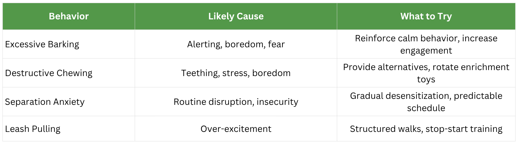 Most behavioral challenges can be traced back to three overlapping categories. While each dog is different, these patterns appear consistently across breeds, ages, and environments.