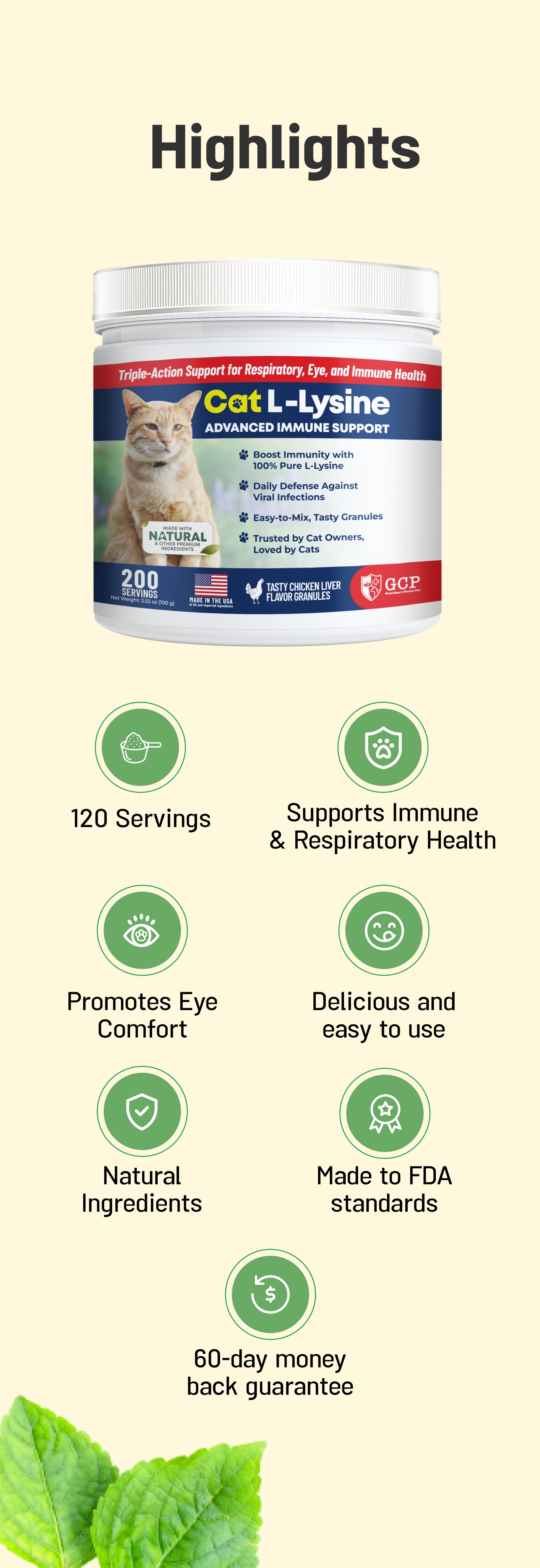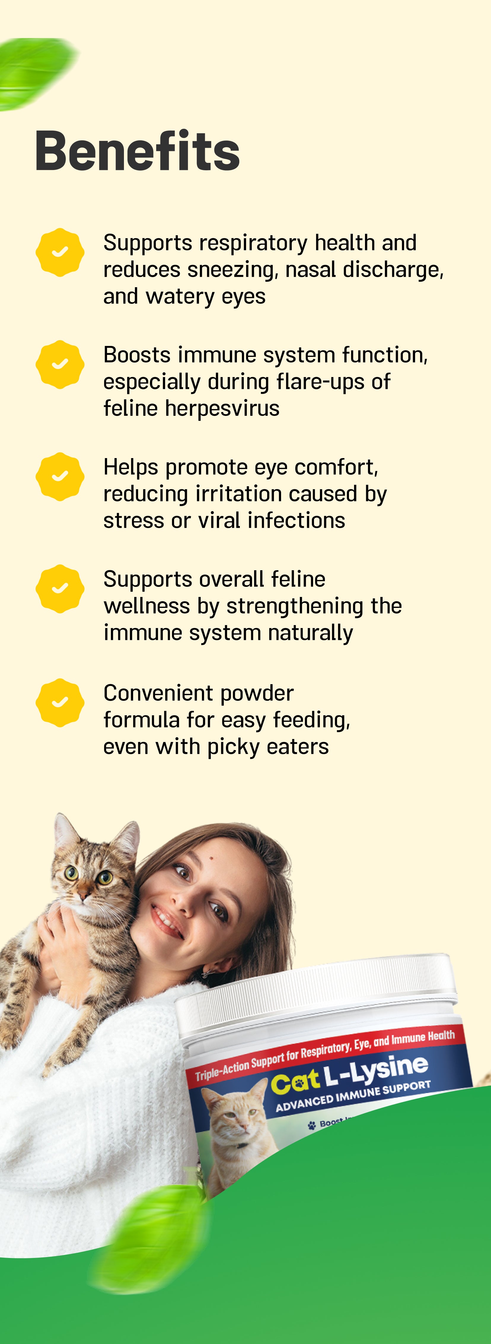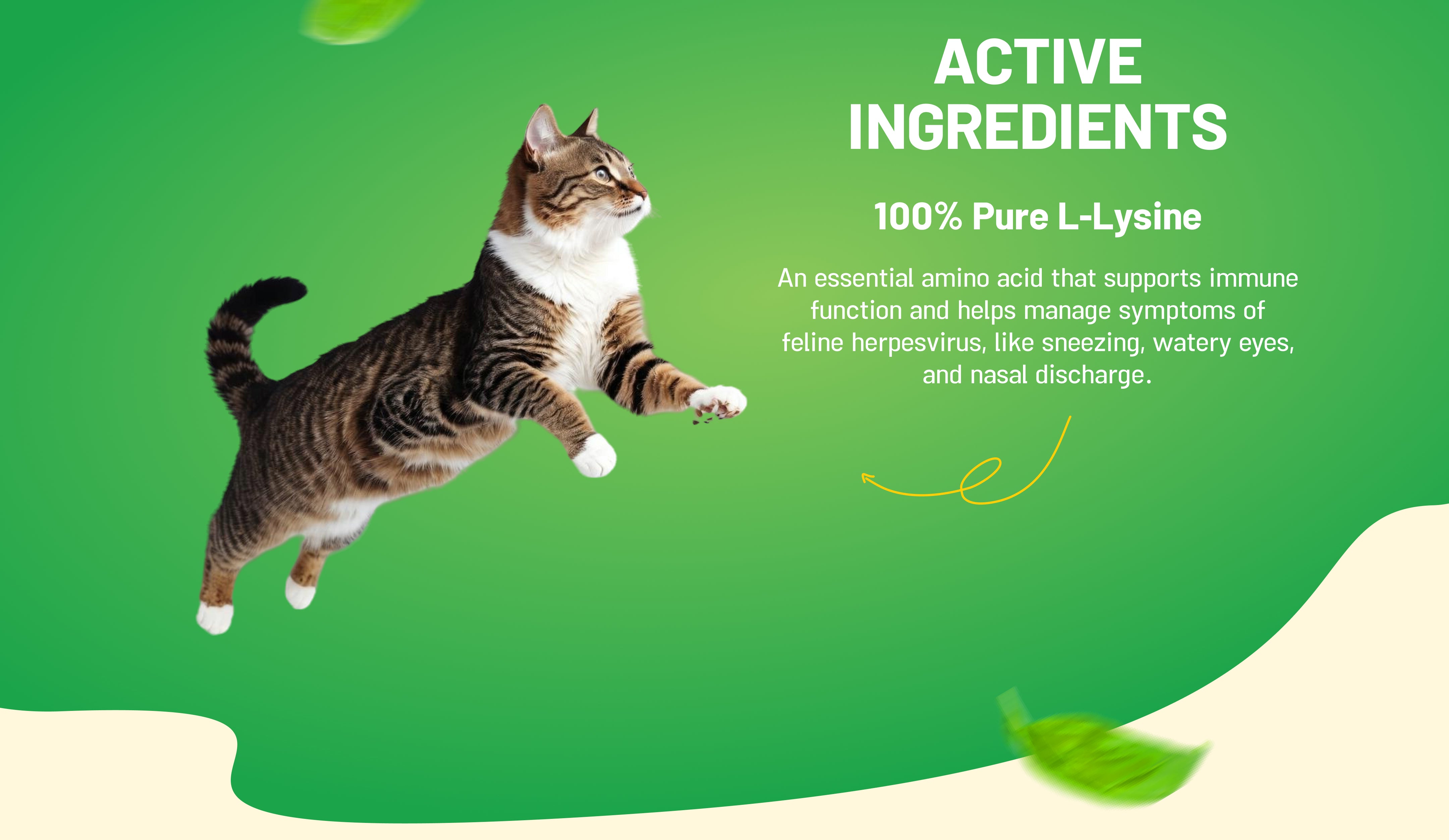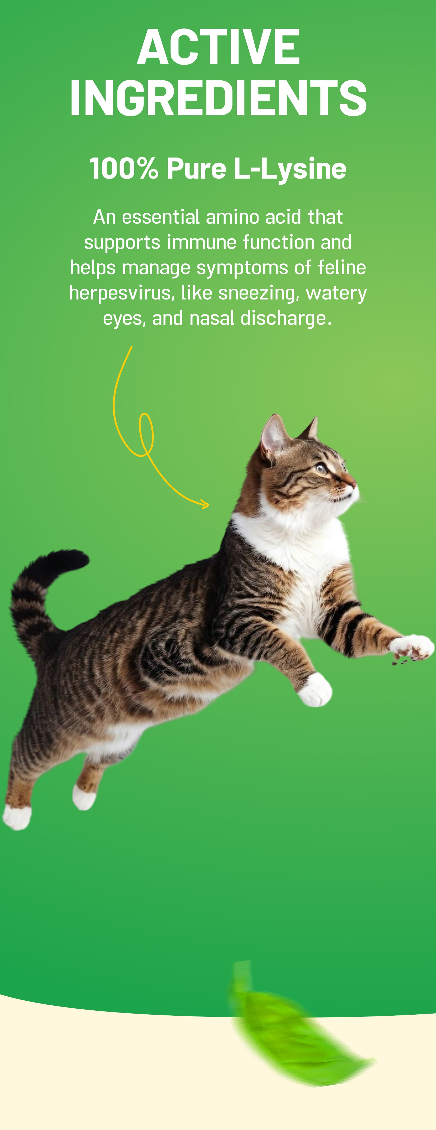 - Reducing flare-ups from feline herpesvirus (sneezing, watery eyes, nasal discharge)