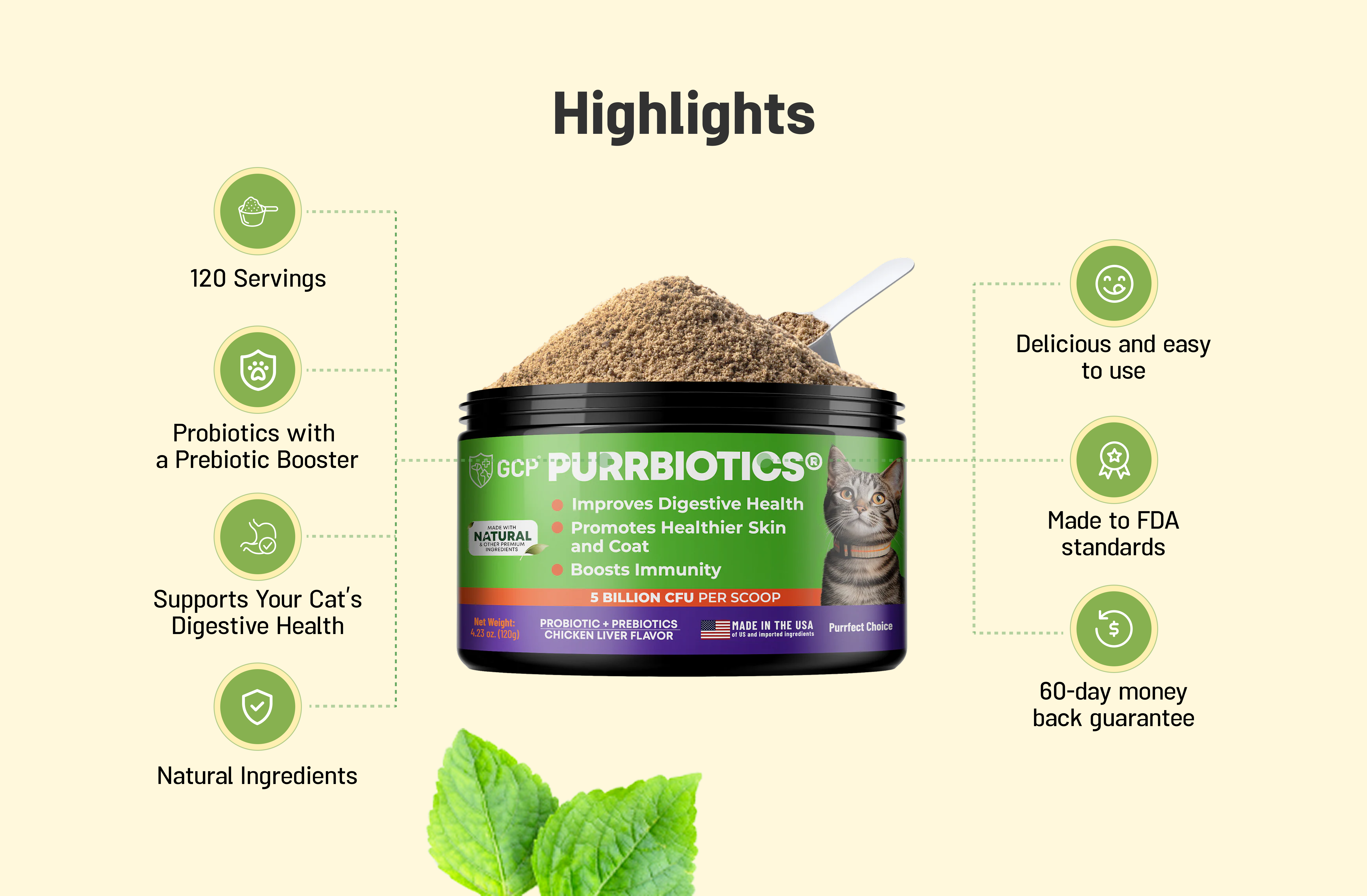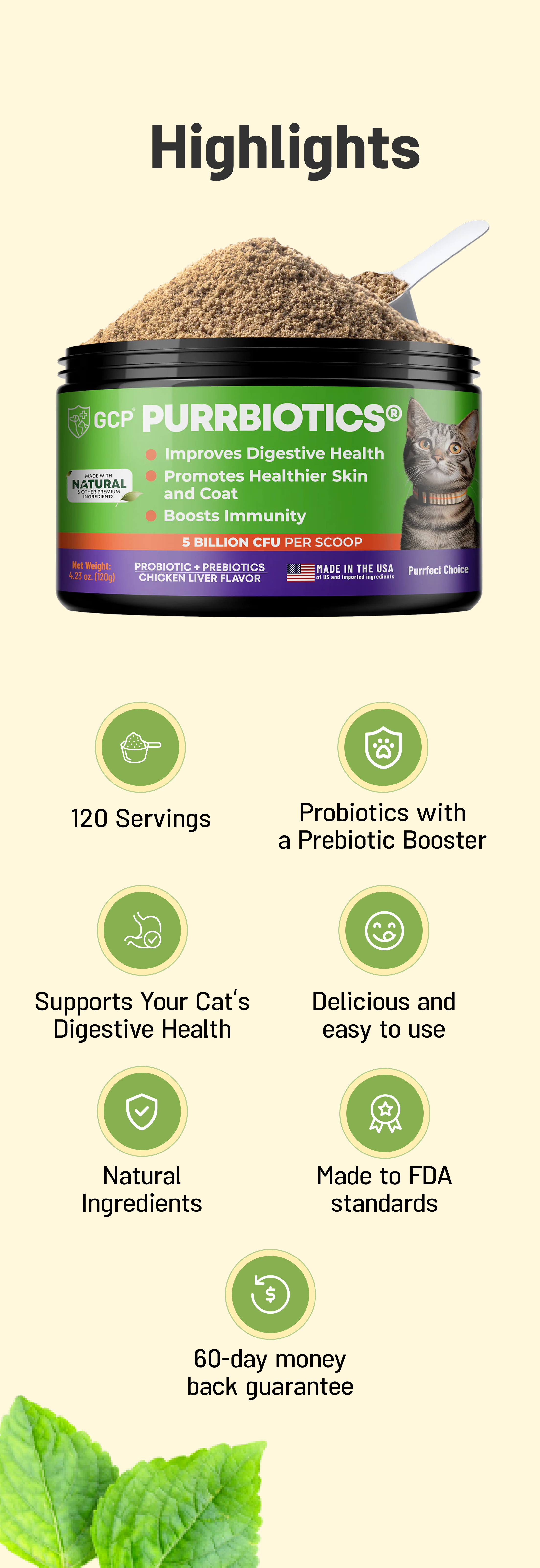 A: GCP Purrbiotics is a multi-strain formula that includes prebiotics for added digestive support. It’s made with natural, food-grade ingredients, contains no fillers or artificial additives, and comes in a powdered form that’s easy to serve.